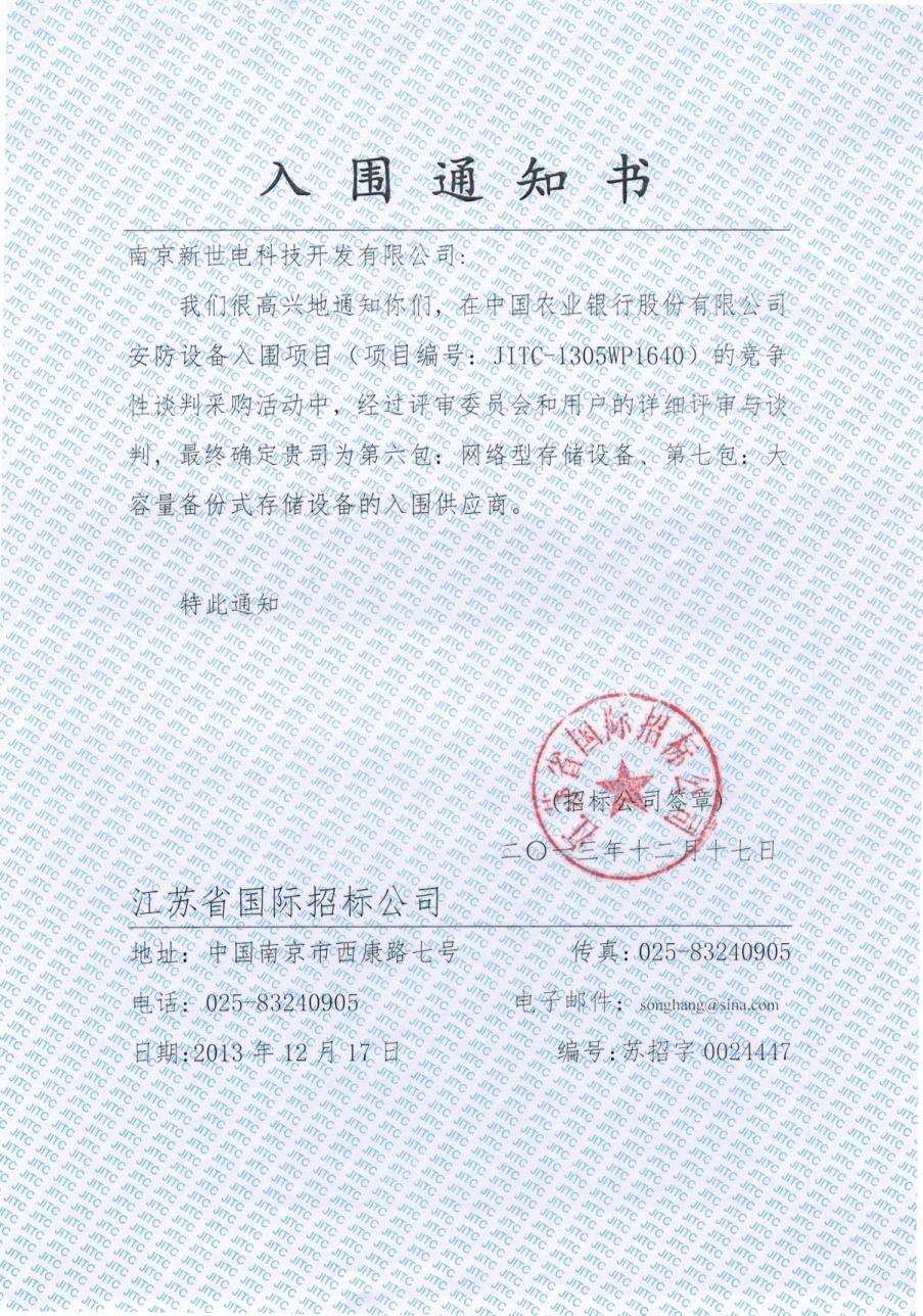 2013年12月17日,公司接到中國農業(yè)銀行總行通知,新世電在中國農業(yè)銀行股份有限公司安防設備入圍項目(項目編號:JITC-1305WP1640)的競爭性談判采購中,經(jīng)評審委員會(huì )和用戶(hù)的詳細評審與談判,最終確定新世電為第六包:網(wǎng)絡(luò )型存儲設備、第七包:大容量備份式存儲設備的入圍供應商。